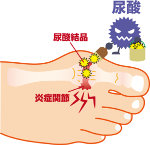 高尿酸血症を放置すると、血液に溶けきれなくなった尿酸が結晶化し、関節に沈着します。この尿酸の結晶が何らかのきっかけで剥がれ落ちると、白血球が「異物」と認識して攻撃するため、炎症が起こり、激しい痛み(痛風発作)を引き起こします。